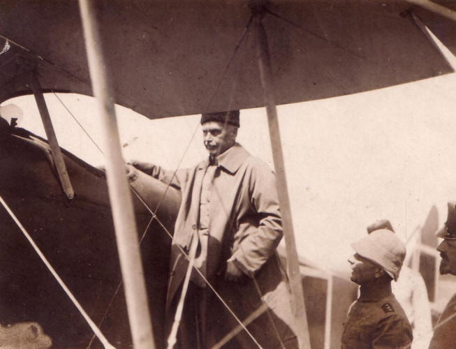 Smyrna im Jahr 1917. Hauptmann Buddecke mit Helm rechts zeigt General Otto Liman von Sanders sein Kampfflugzeug Typ Halberstadt.